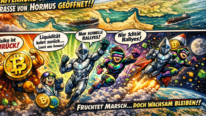 Bei punktgenauen Ereignissen wie der Waffenruhe in Iran sind Domino-Effekte an den Futures Märkten Standard. Ungewöhnlich aber war diesmal, dass Ethereum zeitweise davon stärker betroffen war als Bitcoin, wie Daten von Coinglass zeigen. Liquidiert wurden Positionen, die auf fallende Kryptopreise („shorts“) setzen. Mit Ethereum verloren Händler so im Lauf der Nacht dann letztendlich 126 Millionen Dollar, bei Bitcoin wurden „shorts“ für 245 Millionen liquidiert.